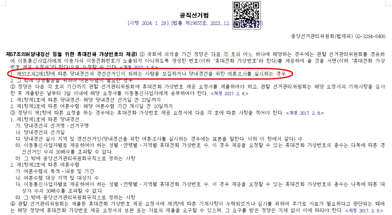 - 공직선거법 제57조8의제1항제1호 '제57조의제1항에 따른 당내경선의 경선선거인이 되려는 사람을 모집하거나 당내경선을 위한 여론조사를 실시하는 경우'에 해당되어 여론조사를 실시하는 것 같습니다.