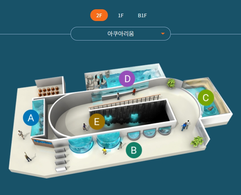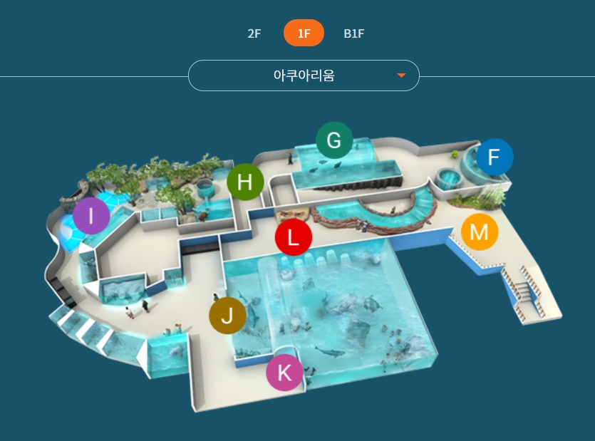 - M : 메인수조 : 가로 23m, 세로 8.5m 초대형 관람창 속에 제주의 바다를 그대로 옮겨놓은듯한 수조